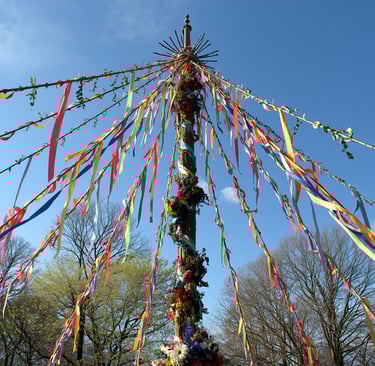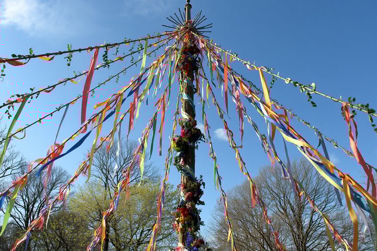 El maypole (palo de mayo) es un poste alto decorado con flores, ramas y cintas que se erige como centro de las celebraciones.
