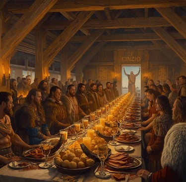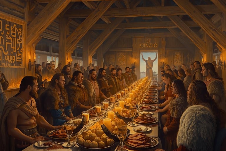 Compartir comida y bebida en comunidad era esencial en las antiguas celebraciones al igual que hoy en dia nos reunimos en las cenas y comidas de Navidad.