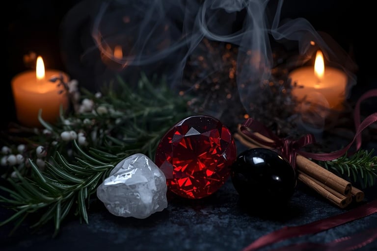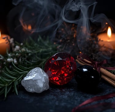 Los aromas y cristales también tienen su papel en Yule. La canela calienta el alma y atrae prosperidad, el clavo protege, el pino purifica. El granate despierta la fuerza vital, el cuarzo blanco limpia y renueva, y la obsidiana protege y ayuda a soltar lo viejo.